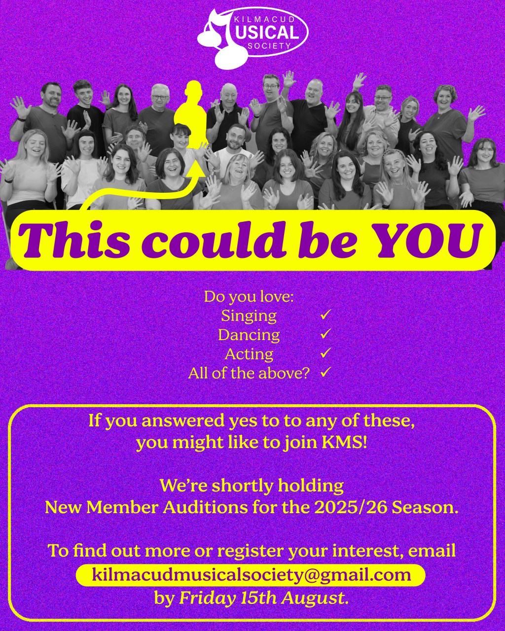 If you want to be part of KMS during this exciting season, email us at kilmacudmusicalsociety@gmail.com by 15th August 2025.